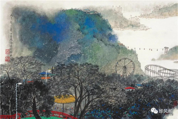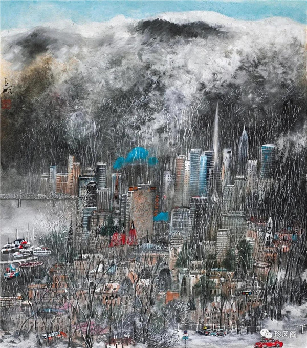 宋玉明從金陵畫派的新傳統(tǒng)跨越到城市表現(xiàn)的積彩拓墨畫法,既體現(xiàn)了現(xiàn)代化城市對(duì)于變革傳統(tǒng)的時(shí)代訴求,也體現(xiàn)了他移居深圳后這座新興城市文化對(duì)于他的深刻影響。畢竟,連續(xù)數(shù)屆的深圳水墨雙年展對(duì)于水墨在跨文化中重要作用與表現(xiàn)方法的突破,都給予他至深的思想開(kāi)拓。這表明,城市山水畫已不單純是用中國(guó)畫表現(xiàn)城市的命題,而是其中能夠蘊(yùn)含多少城市文化觀念與城市審美的方法,宋玉明對(duì)于城市山水畫的探索,體現(xiàn)的正是這樣一種對(duì)城市現(xiàn)代文化的思想融合性。而不拘謹(jǐn)于城市一磚一石、一街一道、一房一樓的描繪,著眼于發(fā)揮水墨與彩墨表現(xiàn)的自由性,抑或體現(xiàn)了人性、自然與現(xiàn)代城市共同作用的現(xiàn)代生活方式與人文理想。的確,純粹用中國(guó)畫或水墨畫來(lái)探索城市的現(xiàn)代化景觀表現(xiàn),也許只是淺層次的審美需求;而只有當(dāng)把山水畫作為人與自然和諧統(tǒng)一的觀念表達(dá)植入城市現(xiàn)代化的審美訴求時(shí),城市山水畫才能真正凸顯出其深刻的美學(xué)價(jià)值。這正是我們從宋玉明的作品里能夠讀解到的他對(duì)于城市山水畫審美理想的一種勾畫。