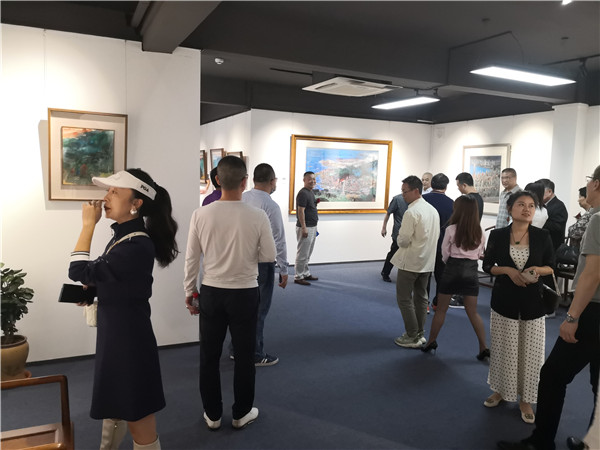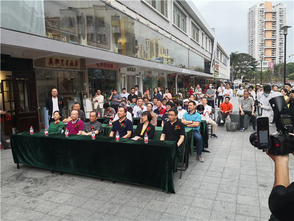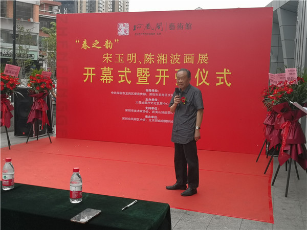 開(kāi)幕儀式上,珍風(fēng)閣藝術(shù)館總經(jīng)理夏雨致辭,感謝一從嘉賓和書畫愛(ài)好者們的捧場(chǎng)。隨后,深圳市美術(shù)家協(xié)會(huì)名譽(yù)主席、深圳美術(shù)館原館長(zhǎng)宋玉明先生致辭。他說(shuō),他來(lái)大芬村多次,一直關(guān)注大芬油畫村的發(fā)展和壯大,認(rèn)為大芬村為全國(guó)書畫走向市場(chǎng)開(kāi)了先例。個(gè)人在此舉辦畫展是首次,感覺(jué)很有意義,是一次走向市場(chǎng)的實(shí)踐機(jī)會(huì),值得珍惜和學(xué)習(xí),也歡迎大家批評(píng)指正。在現(xiàn)場(chǎng),宋玉明老師還回答了主持人的提問(wèn)。他謙虛地說(shuō),這次和陳湘波主席的聯(lián)展,有陳主席的花鳥(niǎo)和自己的城市山水,可以雅俗共賞。陳湘波老師因參加“兩會(huì)”未能出席開(kāi)幕儀式,但在會(huì)后及時(shí)趕到現(xiàn)場(chǎng),表達(dá)自己對(duì)來(lái)賓的感謝和自己對(duì)本次畫展組織的重視和支持。