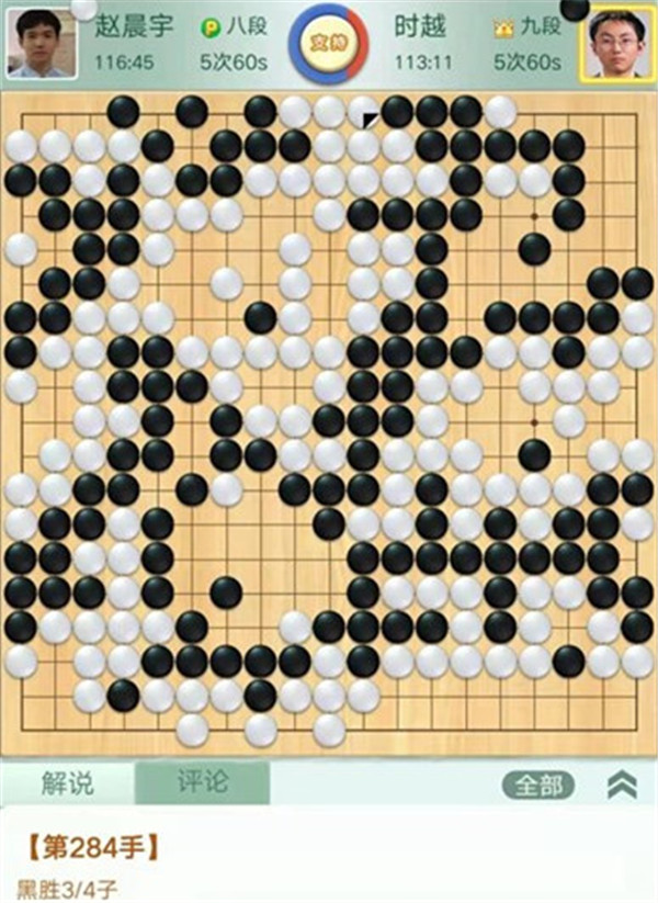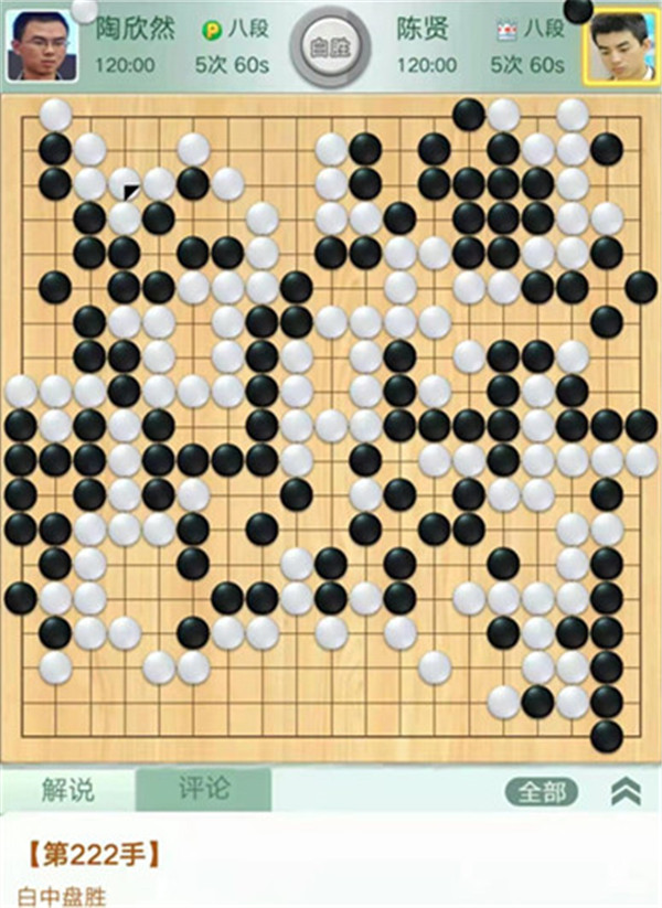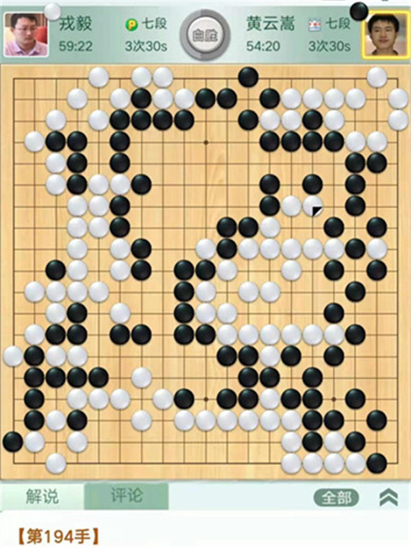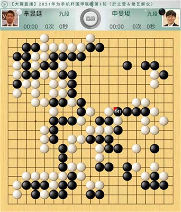 今日比賽中,申旻俊主將執(zhí)黑對(duì)陣新二冠羋昱廷,開局左上角申旻俊配合小米使出羋氏飛刀,結(jié)果是飛刀不成功黑棋局面領(lǐng)先。中盤黑棋攻擊中央白棋時(shí),白棋脫先搶占實(shí)地。被黑手起刀落斬殺大龍,局終。快棋臺(tái),去年屢立戰(zhàn)功的戎毅七段執(zhí)白對(duì)陣黃云嵩七段,行棋穩(wěn)健,占居三個(gè)角之后,又在中間活出一大塊,行棋至194手勝。三臺(tái)陶欣然八段對(duì)陣陳賢八段,行棋222手白中盤勝。四臺(tái)時(shí)越九段對(duì)趙晨宇一戰(zhàn),行至284手,以四分之三子微弱優(yōu)勢(shì)取勝。