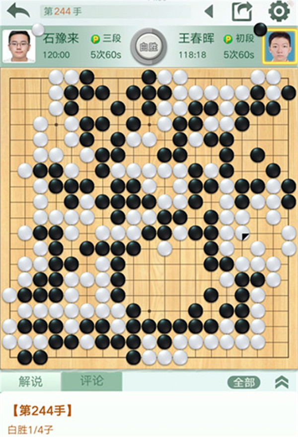 石豫來執(zhí)白對陣小將王春暉。雙方錯進(jìn)錯出,最終黑棋小官子出現(xiàn)問題,白棋幸運1/4子獲勝。