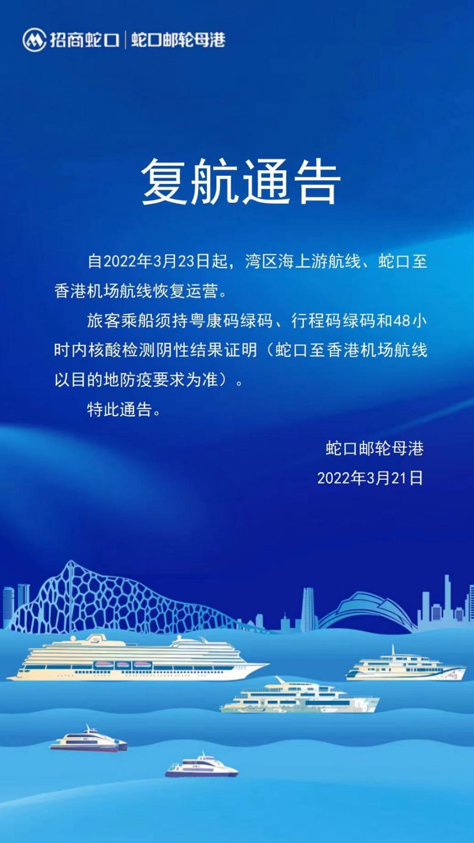 讀特客戶端·深圳新聞網(wǎng)2022年3月21日訊(記者 田志強)記者從招商蛇口郵輪母港獲悉,自3月23日起,灣區(qū)海上游航線、蛇口至香港機場航線恢復運營。旅客須持粵康碼綠碼、行程碼綠碼和48小時內(nèi)核酸檢測陰性結果證明乘船。