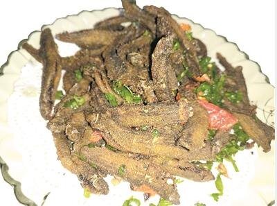 鳙魚(yú)經(jīng)過(guò)割肉后,剩下的骨頭魚(yú)肉可以煎燜或油炸,其味道更加鮮美可口。曾立輝說(shuō),煎燜鳙魚(yú)前,需將姜片與花生油放入油鍋加熱片刻,以避腥味,然后將斬成塊狀的鳙魚(yú)骨肉放入油鍋煎炸成金黃色即可。