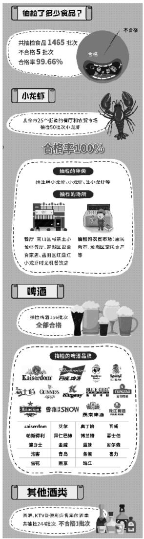 據(jù)了解,在世界杯足球賽開賽前夕,深圳市食藥監(jiān)局就通過網(wǎng)絡(luò)調(diào)查活動(dòng)對(duì)市民票選出的熱門宵夜食品進(jìn)行了抽檢,包括燒烤類食品、啤酒、小龍蝦、零食炒貨堅(jiān)果制品、膨化食品、醬鹵肉制品,同時(shí)對(duì)備受球迷歡迎的酒吧等場所售賣的酒類產(chǎn)品進(jìn)行抽檢。行動(dòng)共抽檢樣品1465批次,發(fā)現(xiàn)不合格樣品5批次,合格率達(dá)99.66%。