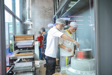 一般的越南河粉店用的是進(jìn)口貨,就算來源再好,在運(yùn)輸過程中總有味道和韌度的流失。傳統(tǒng)河粉機(jī)屬于大型設(shè)備,蔡瀾團(tuán)隊經(jīng)過22個月的研發(fā)和改良,縮小尺寸才能將機(jī)器陳列于餐廳,讓顧客見證新鮮河粉生產(chǎn)制作的全過程:大米浸泡至軟,石磨磨成米漿再蒸熟、切割成河粉,用心打造出一碗新鮮美味的Pho。