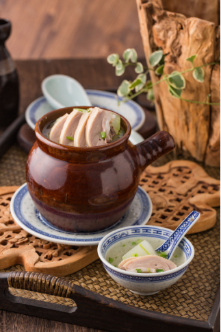 鴨是暑天的清補佳品,健脾化濕,冬瓜性寒味甘,清熱生津。板鴨與冬瓜加入小香蔥煨湯,慢火細燉出,冬瓜軟爛,板鴨酥香,湯味清鮮,是一道僻暑除煩的夏日美味。