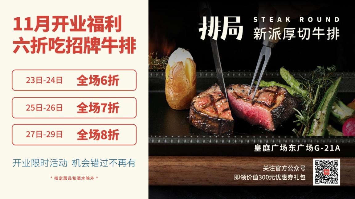 排局·新派厚切牛排為了慶賀開業(yè),也為消費(fèi)者們帶來了勁爆的開業(yè)福利——11月23日至24日兩天全場6折,11月25日至26日兩天全場7折,11月27日至29日三天全場8折。另外搜索“排局”關(guān)注官方公眾號(hào),即可免費(fèi)領(lǐng)取價(jià)值300元優(yōu)惠券禮包。