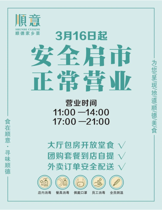 近日,記者發(fā)現(xiàn),深圳人喜愛的順德菜之一順意順德家鄉(xiāng)菜深圳3家門店福華一路店、車公廟店、科技生態(tài)園店已于3月16日全面恢復(fù)正常營業(yè),同時,大廳包房均可開放堂食,外賣服務(wù)同樣進行中,不方便到店消費的也可以叫外賣。