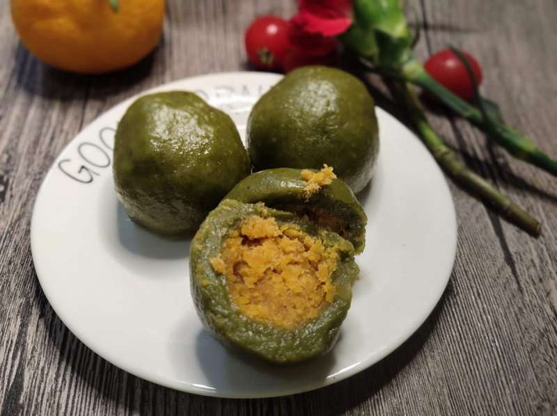 實際上,如果單純用艾草做青團子,蒸熟后顏色暗沉偏黃,不一定特別好看,所以也有粵菜師傅發(fā)明一種改良的做法:用菠菜汁和艾葉汁混合,青團子就呈現鮮綠的顏色。餡料方面,除了可以用最傳統(tǒng)的花生糖餡料,也可以用很多年輕人喜愛的咸蛋肉松餡,咸甜任君選擇。