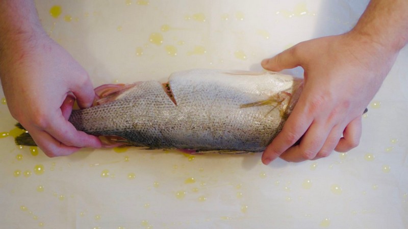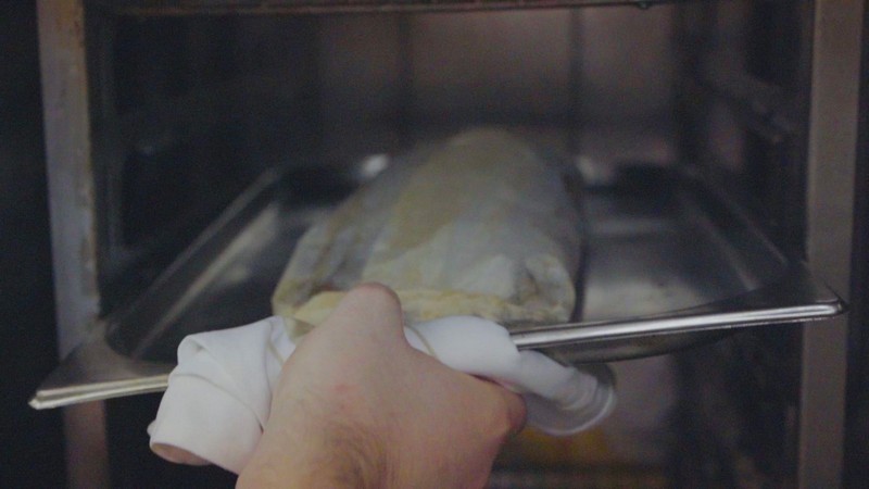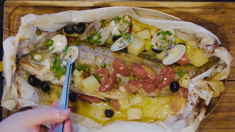清蒸鱸魚是常見的粵式吃法,本期,四季酒店主廚畢柏克為吃貨們帶來別樣的鱸魚吃法——“烤紙包鱸魚”。他將魚進(jìn)行腌制后,用烘焙用紙裹緊,在烤爐中烤制40分鐘。吸收了海鮮文蛤、白葡萄酒精華的魚肉緊實鮮嫩,在打開外包紙的那一刻,香氣四溢,讓人欲罷不能。如此烹法,也能最大限度保存魚的營養(yǎng)和鮮美。