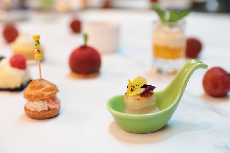酒店餅房廚師長趙偉匠心獨運,使荔枝和傳統(tǒng)下午茶碰撞出別樣風情:芒果恰到好處的酸甜邂逅荔枝的宜人甘美,香芒荔枝慕斯杯里滿載的不就是夏天的專屬甜蜜;芝士蛋糕的醇厚滋味被荔枝的清爽巧妙平衡,多層次的口感讓人無限回味;當俏皮可人的荔枝被加入傳統(tǒng)甜品楊枝甘露,搭配冰涼爽口的荔枝雪芭,是妙趣橫生的獨特味覺體驗;法式焦糖燉蛋和荔枝的融合,恍若天成,是中西合璧的典范;日本帶子和荔枝的組合聽來不可思議,只有親試方能體會海陸鮮甜交匯的真意。