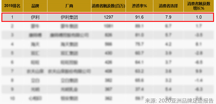 見圳客戶端·深圳新聞網(wǎng)2020年6月23日訊 日前,凱度消費(fèi)者指數(shù)發(fā)布了《2020亞洲品牌足跡報(bào)告》。伊利憑借91.6%的品牌滲透率、近13億的消費(fèi)者觸及數(shù)和近8次的購(gòu)買頻次,連續(xù)五年位列中國(guó)市場(chǎng)消費(fèi)者選擇最多的品牌榜首。綜合報(bào)告數(shù)據(jù)顯示,伊利各項(xiàng)指標(biāo)在榜單中領(lǐng)先于其他品牌,持續(xù)領(lǐng)跑中國(guó)快消品市場(chǎng)。
