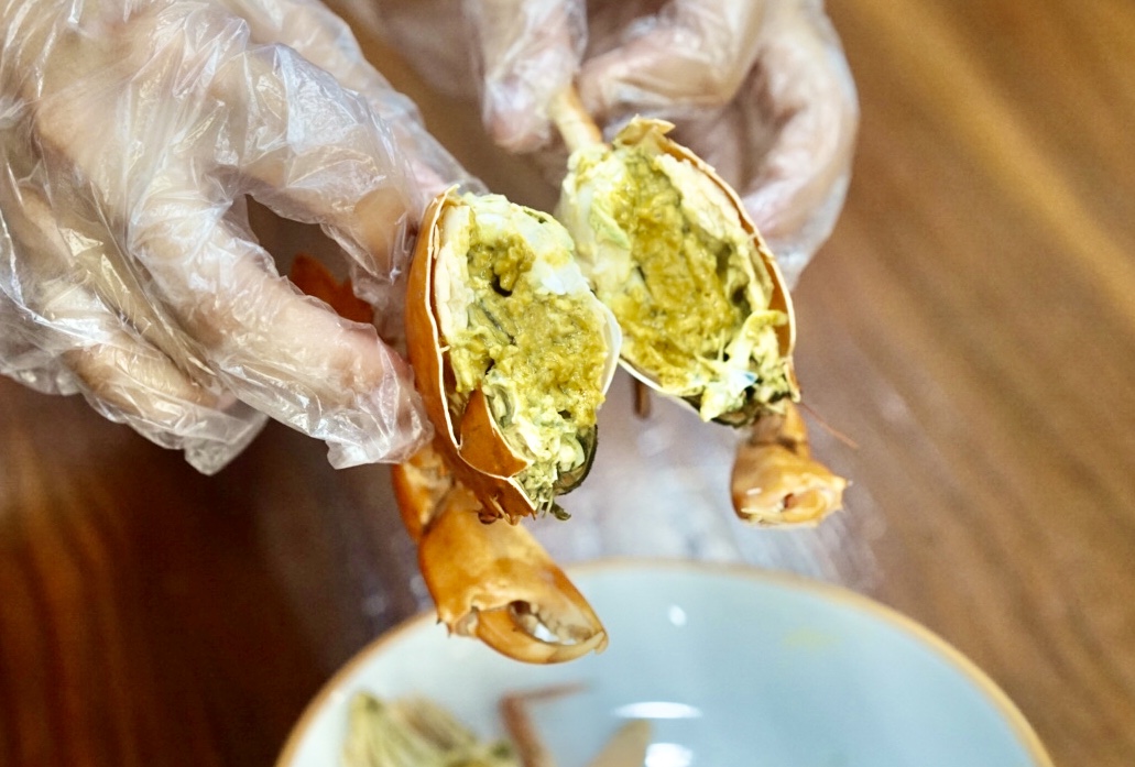 番禺美食家屈九先生說,石樓鎮(zhèn)的咸淡水交界區(qū)域是產(chǎn)蟹佳地。他曾說,如果有幸遇上換殼期的重皮奄仔蟹則更佳,硬殼底下有一層新生的軟殼,蟹膏濃滑似流沙蛋黃,非常滋味。成隆行廣州區(qū)域負責人楊先生則說,深圳本地奄仔蟹量有限,以精養(yǎng)為主。