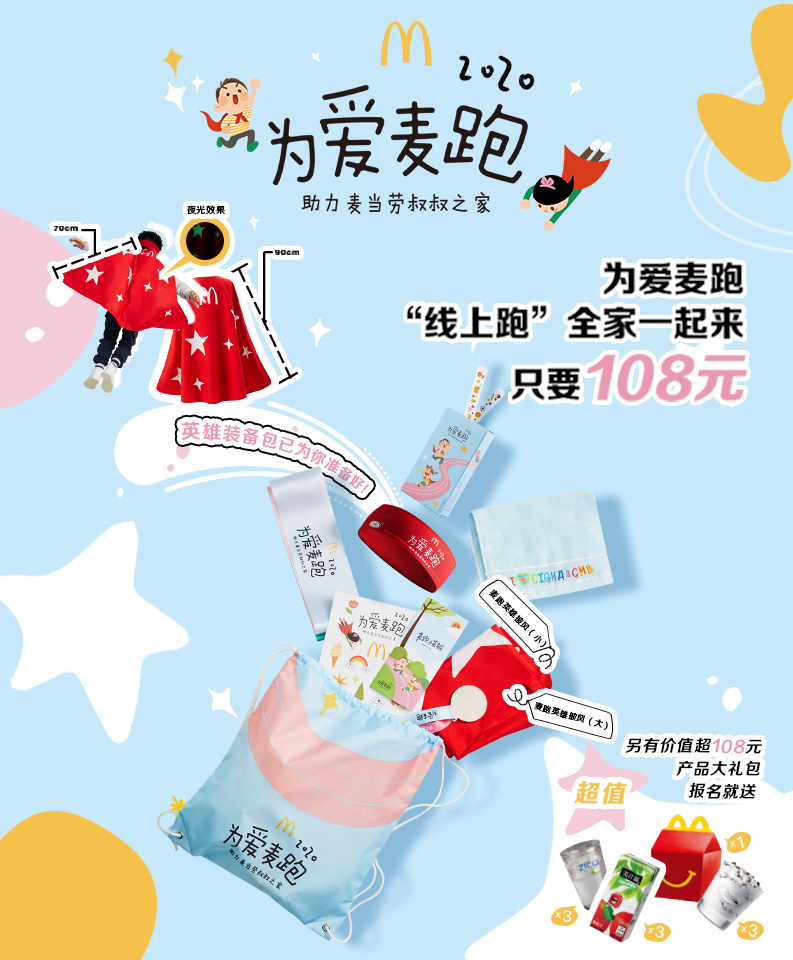 “為愛麥跑”為參跑家庭準備的裝備包,在特殊的年份帶來特別的跑步體驗和親子互動時光。參跑家庭報名成功后,裝備包將直接寄送到顧客手中(港澳臺地區(qū)除外)。每寄出一份裝備包,“為愛麥跑”將向麥當勞叔叔之家捐出10元。裝備包先報名先得,售完即止。
