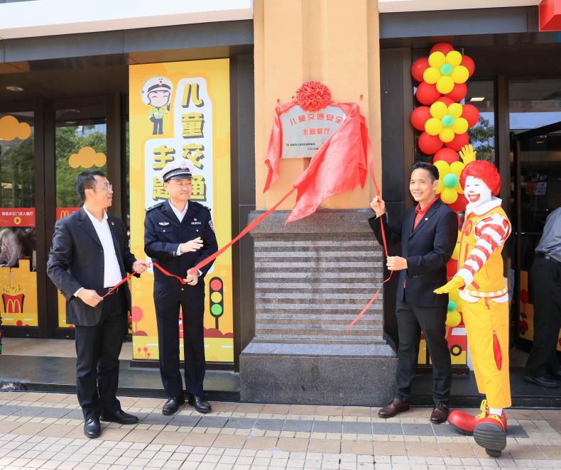 深圳市交警局、福田區(qū)香蜜湖街道辦、深圳麥當勞領導與麥當勞首席快樂官麥當勞叔叔共同為全國首家麥當勞兒童交通安全主題餐廳揭牌