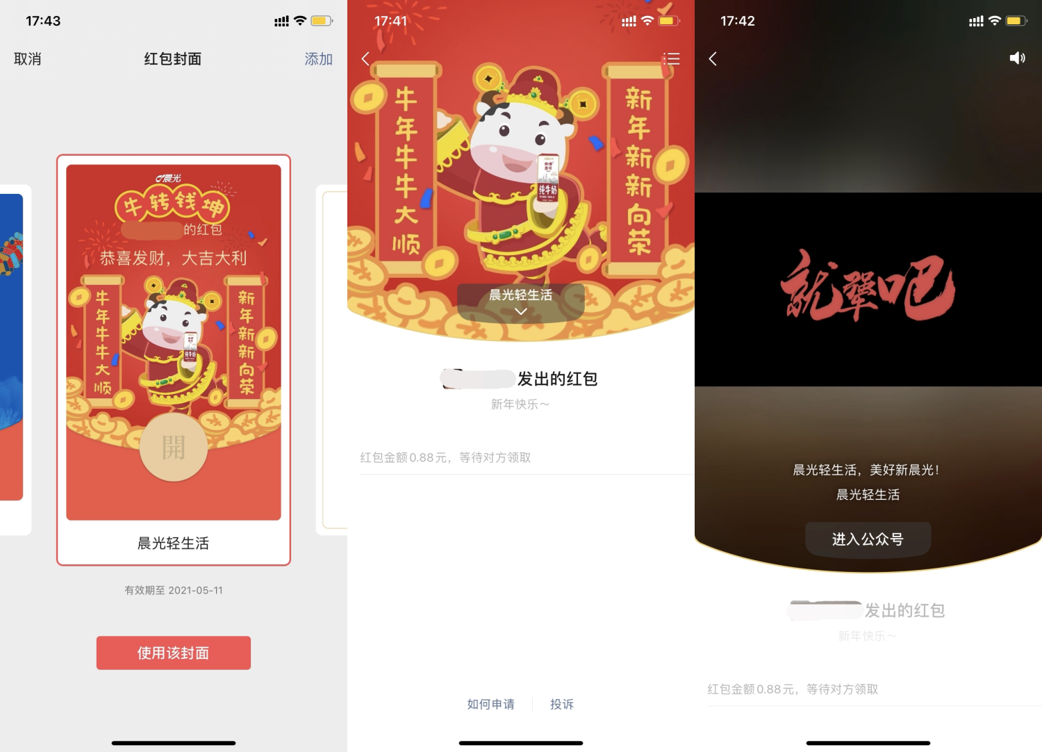 2021年的春節(jié)線上定制紅包封面成為網(wǎng)民熱議的話題,相較于往年的春節(jié)紅包,各具特色、風格不一的紅包封面無疑是今年最明顯的特色了。晨光乳業(yè)也為此做出了嘗試,針對晨光牛奶用戶和粉絲大膽設計,將憨態(tài)可掬的品牌IP放置在封面C位。無疑,這波寵粉操作有助晨光牛奶獲得更多粉絲的點贊,增強用戶粘度。