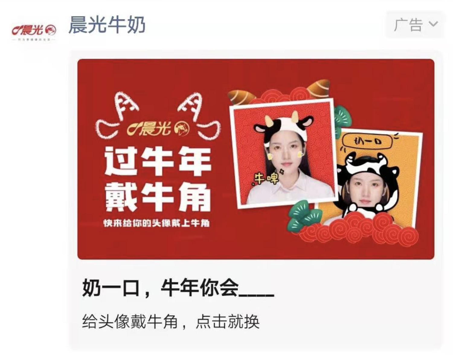 春節(jié),正是各大品牌爭相出招時刻,如何在一眾營銷活動中突出重圍吸引用戶關注?洞察到用戶在春節(jié)期間“換個喜慶頭像”以及“發(fā)紅包”的強需求,晨光乳業(yè)趣味游戲H5“換個頭像犟牛年”和“定制紅包”于除夕前上線,邀請用戶為現(xiàn)有微信頭像戴上“牛角”。牛角頭像不僅可以用于微信,也可用于其他社交平臺。