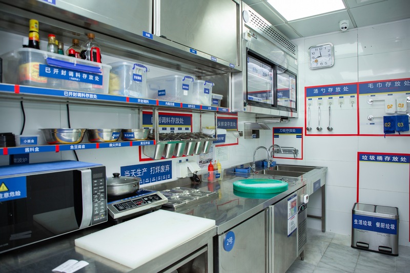 “右手邊是冷菜間,因為食安要求更高,我們都有專門的‘二次更衣室’,在這里更換衣服后,再進入對涼菜進行處理?!必撠熑吮硎?,在專門的涼菜區(qū)里,則可以看到櫥窗中整齊地貼上了諸如“A1圣女果”“B04魚豆腐”之類的標簽,同時備注“當天生產打烊廢棄”和“加工日期與廢棄日期”等具體操作指示。“每晚打烊后,我們也會用紫外線燈對冷菜間進行半個小時的消毒?!必撠熑搜a充。