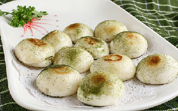 發(fā)酵好后,將綠面團分劑搟成圓皮,白面團分劑揉成小圓球,綠皮對折后在中間挖去一小部分,展開后放入三個豆子,邊緣捏緊,上鍋蒸熟。