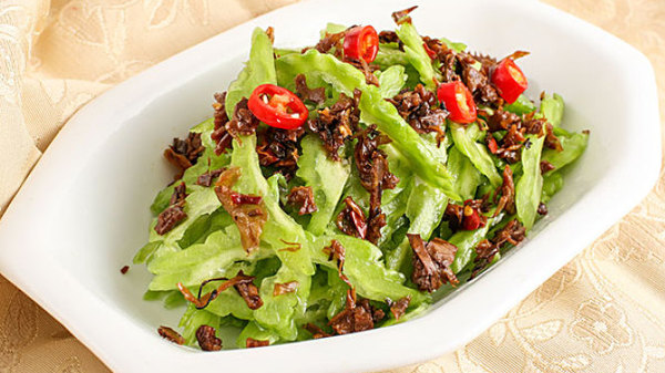 鍋中油熱(用雞油炒香),下蠶豆米翻炒,再加水炒至沸騰后三分鐘,加萵筍、荸薺煸炒片刻,加少量鹽炒勻。