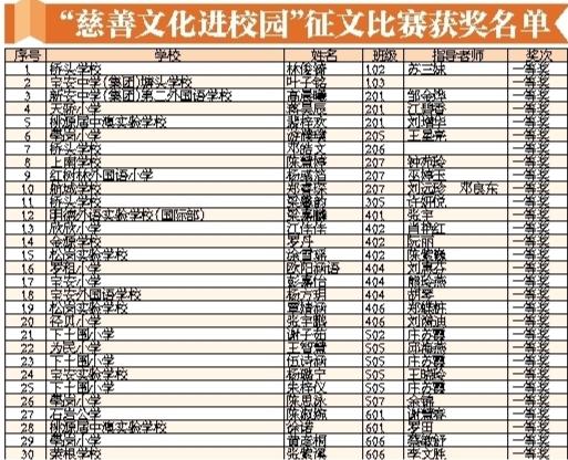 寶安日?qǐng)?bào)2020年1月2日訊 2019年12月31日下午,寶安區(qū)慈善文化進(jìn)校園征文比賽表彰暨2019年度工作總結(jié)會(huì)在寶安實(shí)驗(yàn)學(xué)校會(huì)議室舉行。會(huì)上對(duì)征文比賽獲獎(jiǎng)?wù)吆蛢?yōu)秀組織單位進(jìn)行表彰。學(xué)生代表分享慈善故事,學(xué)校代表則分享慈善文化進(jìn)校園經(jīng)驗(yàn)。此次慈善文化進(jìn)校園征文活動(dòng)是由區(qū)教育局、區(qū)慈善會(huì)、寶安日?qǐng)?bào)社、寶安廣電中心共同主辦,征文主題是“慈善在我身邊”,活動(dòng)在全區(qū)中小學(xué)生中進(jìn)行征集。經(jīng)過兩個(gè)月的征集和評(píng)比,最終評(píng)出3個(gè)組別的一、二、三等獎(jiǎng)和優(yōu)秀組織單位。