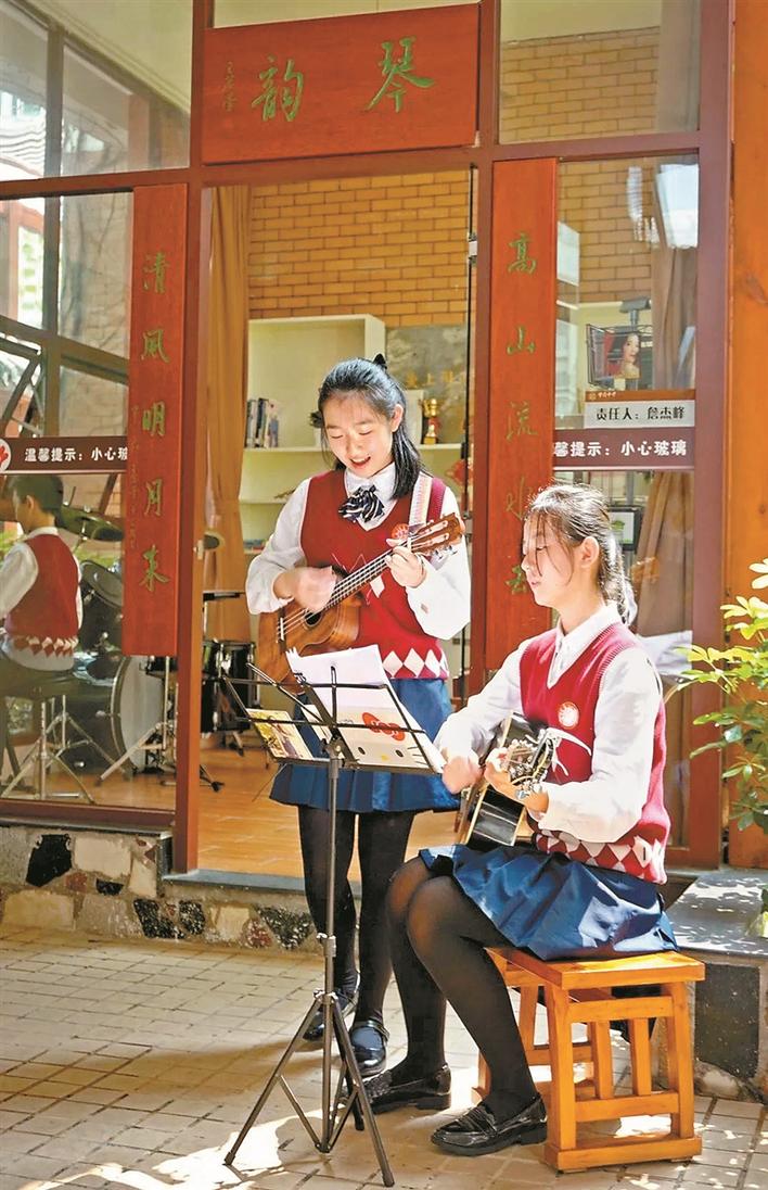 校園一角的“樂·舞臺(tái)”上擺放著一架鋼琴,陳鐵成校長(zhǎng)說:“在沒有疫情的時(shí)候,這架鋼琴是不上鎖的,任何老師或?qū)W生都可以彈奏。同樣開放的還有琴韻閣、清心閣,不要擔(dān)心學(xué)生會(huì)破壞這些東西,美自然地呈現(xiàn)在學(xué)生們面前,自然地發(fā)生,真正的教育就是在這樣的情境中發(fā)生的。”