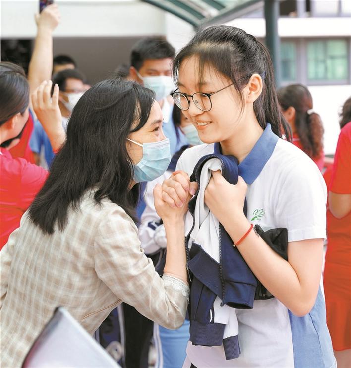 準備進入考場的育才中學(xué)考生與老師微笑握手,帶著老師的美好祝愿自信面對人生大考。深圳特區(qū)報記者周紅聲攝
