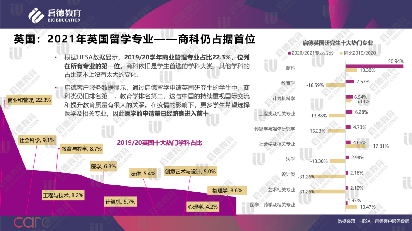 長期以來,由于其廣闊的就業(yè)前景,F(xiàn)AME專業(yè)(金融、會計(jì)、管理、經(jīng)濟(jì))和STEM專業(yè)(科學(xué)、技術(shù)、工程和數(shù)學(xué))一直備受留學(xué)生的青睞。2021 《美國門戶開放報(bào)告》數(shù)據(jù)顯示,半數(shù)以上的中國內(nèi)地學(xué)生就讀STEM專業(yè)(物理/自然科學(xué)、工程學(xué)、醫(yī)療健康、數(shù)學(xué) /計(jì)算機(jī) ),16.6%就讀商業(yè)與管理專業(yè)。英國高等教育統(tǒng)計(jì)局 HESA數(shù)據(jù)顯示,2019/20學(xué)年商業(yè)管理專業(yè)占比為22.3%,位列在英國研究生專業(yè)的第一位,其他依次為:社會科學(xué)、教育與教學(xué)、工程與技術(shù)、醫(yī)學(xué)、計(jì)算機(jī)、法律、創(chuàng)意藝術(shù)與設(shè)計(jì)、心理學(xué)以及物理學(xué)。