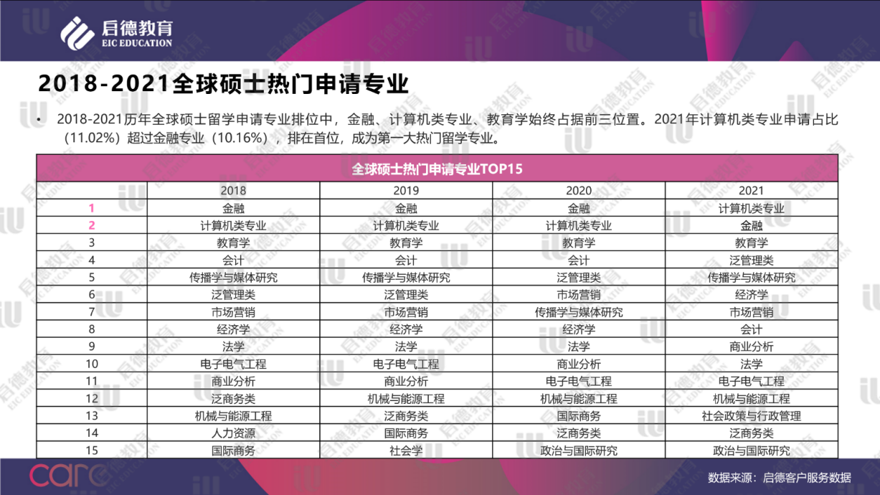 啟德留學(xué)客戶服務(wù)數(shù)據(jù)顯示,2018-2021歷年全球碩士留學(xué)申請專業(yè)排位中,金融、計(jì)算機(jī)類專業(yè)、教育學(xué)始終占據(jù)前三位置。2021年,計(jì)算機(jī)科學(xué)與信息系統(tǒng)(偏理科)、計(jì)算機(jī)科學(xué)與信息系統(tǒng)(偏工科)、電子與計(jì)算機(jī)工程、數(shù)據(jù)科學(xué)這四個(gè)計(jì)算機(jī)類專業(yè)的碩士申請占比合計(jì)為11.02%,超過金融專業(yè)(10.16%),成為第一大熱門留學(xué)專業(yè)。2021商科申請占比超過40%,理工科申請占比超過四分之一。其中,商科熱門碩士專業(yè)金融(10.16% )、經(jīng)濟(jì)學(xué)(4.63% )、市場營銷(4.43% )、會計(jì)(3.92% )、商業(yè)分析(2.99% )的申請占比為26.13%,理工科熱門碩士專業(yè)計(jì)算機(jī)(11.02% )、電子電氣工程(2.66% )、機(jī)械與能源工程(2.15% )的申請占比為15.83%。
