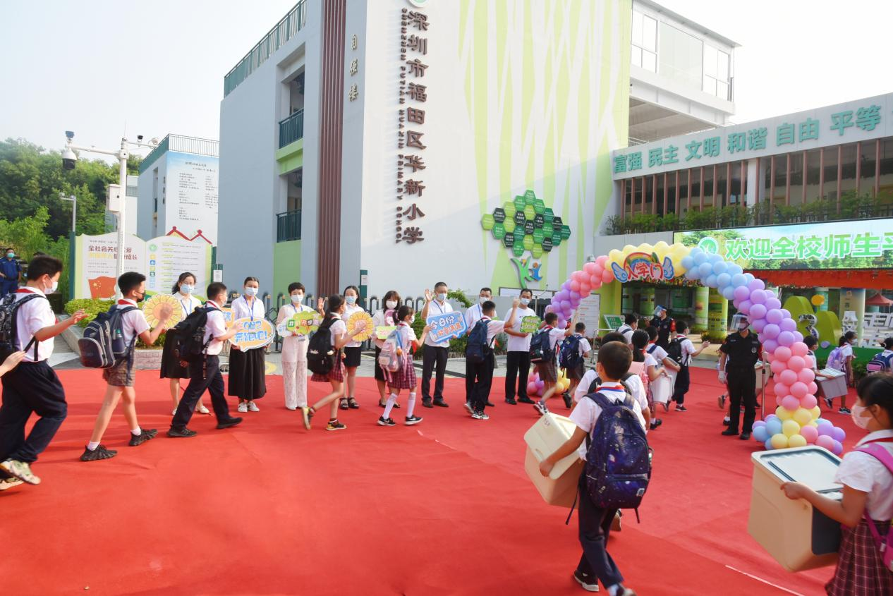 華新小學(xué)校領(lǐng)導(dǎo)和老師們在校門迎接學(xué)生的歸來。(華新小學(xué)供圖)