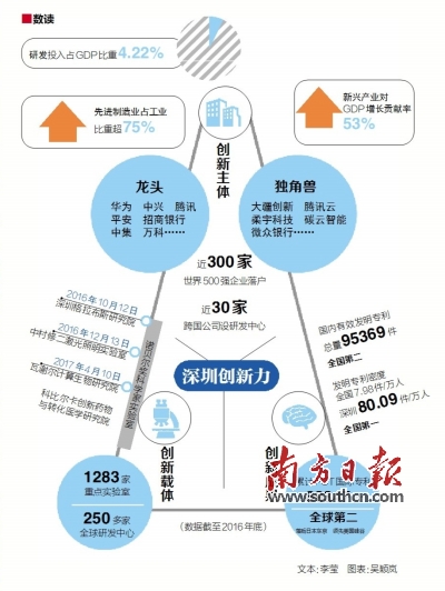 其一,企業(yè)主導(dǎo),政府給力。在整個(gè)創(chuàng)新體系中,企業(yè)是技術(shù)創(chuàng)新主體,代表著市場取向;政府是制度創(chuàng)新的主體,主要任務(wù)是營造良好的創(chuàng)新環(huán)境,彌補(bǔ)市場失靈的不足。只有處理好政府和市場的關(guān)系,才能推動整個(gè)創(chuàng)新體系不斷完善。因此,深圳一方面讓企業(yè)唱主角,支持企業(yè)創(chuàng)新創(chuàng)業(yè),華為、中興、騰訊、比亞迪等“龍頭”企業(yè)持續(xù)做大做強(qiáng),大疆創(chuàng)新、光啟、柔宇科技等“獨(dú)角獸”企業(yè)迅速發(fā)展;另一方面,政府從政策和規(guī)劃層面加強(qiáng)創(chuàng)新體系頂層設(shè)計(jì),圍繞科技管理機(jī)制創(chuàng)新、創(chuàng)業(yè)創(chuàng)新能力提升、強(qiáng)化對外合作等方面構(gòu)建政策支持體系,以企業(yè)為創(chuàng)新驅(qū)動核心、以企業(yè)家群體為創(chuàng)新精神內(nèi)核、政策金融人才協(xié)同共生的創(chuàng)新生態(tài)系統(tǒng)加速形成。