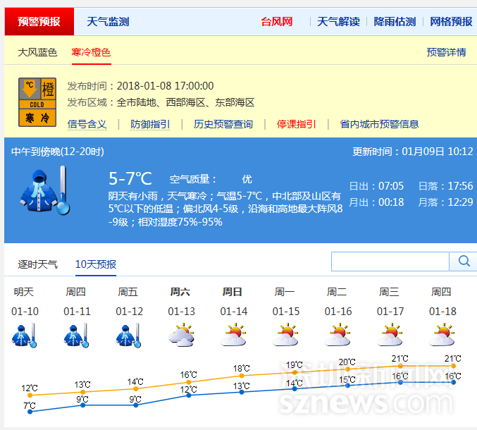 據(jù)悉,2016年1月末,深圳首次記錄到冰粒,國家基本站記錄到創(chuàng)特區(qū)以來最低氣溫1.7℃。昨日17時,深圳市氣象臺發(fā)布消息稱,將深圳市寒冷黃色預(yù)警升級,時隔兩年寒冷橙色預(yù)警再現(xiàn)深圳。預(yù)計今日深圳市最低氣溫將降至5 以下,信號持續(xù)1天。