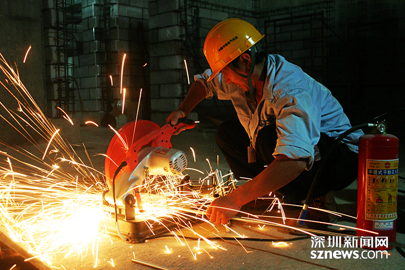 在地鐵6號線大浪站,一名地鐵工人正在進(jìn)行材料切割,火花飛濺,旁邊是干粉滅火器