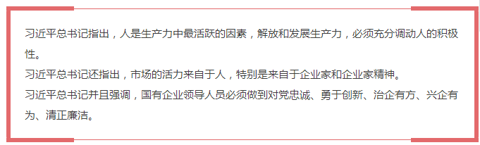 中國特色社會主義進(jìn)入新時代,建設(shè)現(xiàn)代化經(jīng)濟(jì)體系,推動經(jīng)濟(jì)發(fā)展質(zhì)量變革、效率變革、動力變革,需要更好發(fā)揮包括國有企業(yè)家在內(nèi)的廣大企業(yè)家的作用。去年黨中央專門印發(fā)了《關(guān)于營造企業(yè)家健康成長環(huán)境,弘揚(yáng)企業(yè)家精神、更好發(fā)揮企業(yè)家作用的意見》,極大地調(diào)動了企業(yè)家干事創(chuàng)業(yè)的積極性。落實好中央精神,關(guān)心愛護(hù)企業(yè)家,需要各方面共同努力。