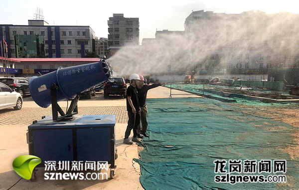 4月10日,記者實(shí)地走訪了龍崗區(qū)多個(gè)建筑工地,現(xiàn)場(chǎng)看到各工地在入口處都已安裝TSP在線監(jiān)測(cè)設(shè)備,實(shí)時(shí)監(jiān)測(cè)場(chǎng)區(qū)揚(yáng)塵;除塵霧炮機(jī)正朝建筑場(chǎng)地噴灑霧水;裸露泥土被綠色防塵網(wǎng)遮蓋;泥頭車等車輛進(jìn)出都需沖洗車身。