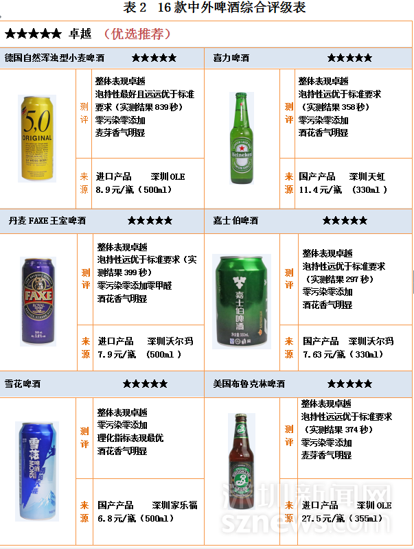 16款中外啤酒中,6款評級五星,國產(chǎn)與進口各3款,分別為:德國自然渾濁型小麥啤酒 、喜力啤酒 、丹麥FAXE王室啤酒 、嘉士伯啤酒、 雪花啤酒、美國布魯克林啤酒。獲得四星評級的有6款,國產(chǎn)5款進口1款,4款三星評級均為進口啤酒。另外,16款中外啤酒均未出現(xiàn)違規(guī)使用添加劑和污染物超標(biāo)情況,均符合國家食品安全標(biāo)準,甲醛含量均優(yōu)于國標(biāo)要求。
