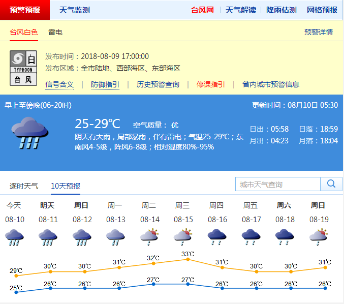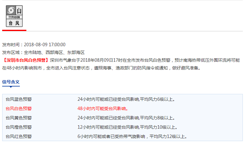 市氣象局于8月9日17時發(fā)布臺風白色預警信號