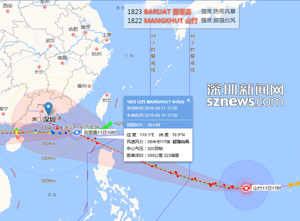 深圳新聞網(wǎng)9月12日訊(記者 施冰冰)記者從深圳市氣象局了解到位于臺灣東南部海面的熱帶擾動已于10日8時加強(qiáng)為熱帶低壓,預(yù)計該熱帶低壓將于11日進(jìn)入南海,并加強(qiáng)為今年第23號臺風(fēng),12日下午到夜間從深圳市偏南方200-250公里的海面上掠過,13日白天在廣東電白到海南瓊海之間的沿海地區(qū)登陸。此外,今年第22號臺風(fēng)“山竹”已于7日夜間生成,10日14 時位于深圳市東南方約3500公里的西北太平洋洋面上,中心附近最大風(fēng)力13級。未來將以30公里左右的時速向偏西方移動,最強(qiáng)可達(dá)超強(qiáng)臺風(fēng),15日進(jìn)入南海,16-17日嚴(yán)重影響廣東。