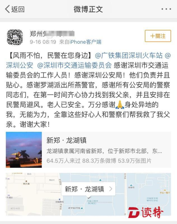 原標題:臺風(fēng)天老人坐不上火車,和在河南的女兒失聯(lián)!深圳警方徹夜尋找
