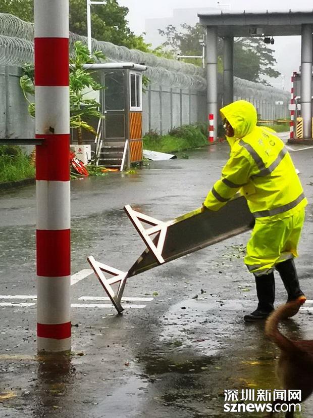 邊檢民警冒雨在拾取被強(qiáng)臺風(fēng)掀倒現(xiàn)場通關(guān)標(biāo)識牌