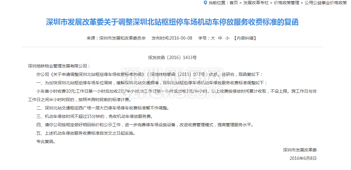 2016年深圳市發(fā)改委調(diào)整深圳北站停車收費(fèi)政策