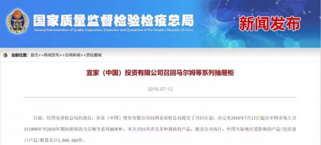 2016年7月12日,國家質(zhì)檢總局官網(wǎng)宣布,經(jīng)約談后,宜家(中國)投資有限公司向國家質(zhì)檢總局提交了召回計(jì)劃,決定在中國市場上召回1999年至2016年期間銷售的馬爾姆等系列抽屜柜。本次召回中國大陸地區(qū)受影響的產(chǎn)品 (包括進(jìn)口產(chǎn)品 )數(shù)量共166萬件。