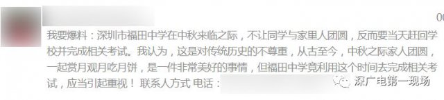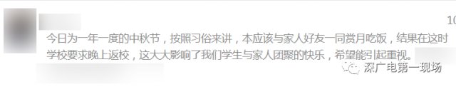 今天,深圳市高級中學、深圳市福田中學、沙井中學、東方英文書院的一些高中學生,通過在線留言等多種方式,向欄目反映,中秋節(jié)是法定假日,但他們卻沒法和家人一起吃飯團聚,更別提賞月看晚會了,原因是學校要求寄宿的學生今天晚上要提早返校,參加晚自習或者考試。