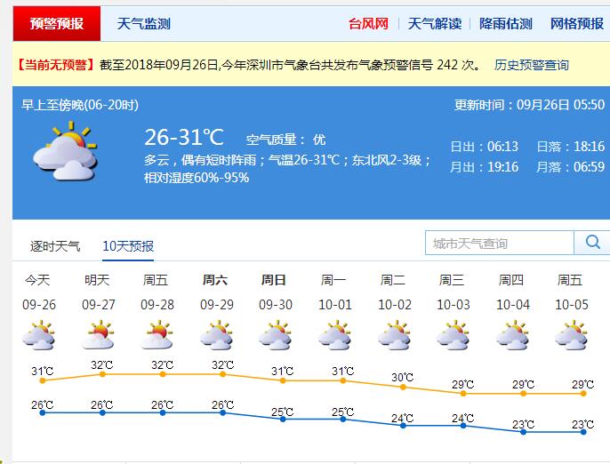 深圳市氣象臺預計,26日我市多云,局部有陣雨,氣溫26-32 ℃;27-30日受偏北氣流控制,晴天間多云,空氣干燥,最小相對濕度低至50%以下,需注意居家用火安全,其中29-30日部分時間有輕微到輕度霾,能見度較差。