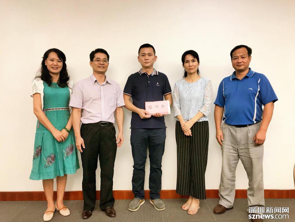 從左至右:梅林中學(xué)黨總支部書(shū)記何俊、深圳市教育局德體衛(wèi)藝處副處長(zhǎng)勞期龍、李得父親、深圳市關(guān)愛(ài)辦副主任華榮、李得教練范華平