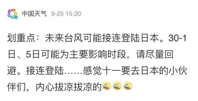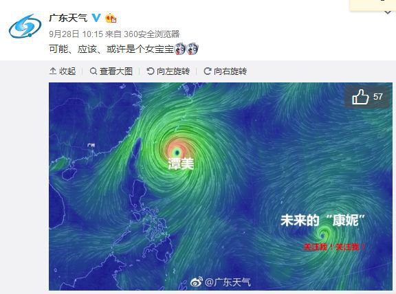 另據(jù) @廣州天氣,"潭美"28-29日最接近臺灣,隨后掉頭往東北方向移動,國慶期間前往臺灣的朋友不用擔(dān)心。