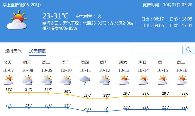 預(yù)計(jì)10月7-9日我市多云間晴天,氣溫23℃-31℃,空氣濕度將略有回升,但最小相對(duì)濕度仍在50%或以下,干燥天氣持續(xù)。未來(lái)三天天氣總體穩(wěn)定,氣溫波動(dòng)不大,適合外出活動(dòng),戶外活動(dòng)需多補(bǔ)充水分,適當(dāng)做好護(hù)膚措施。