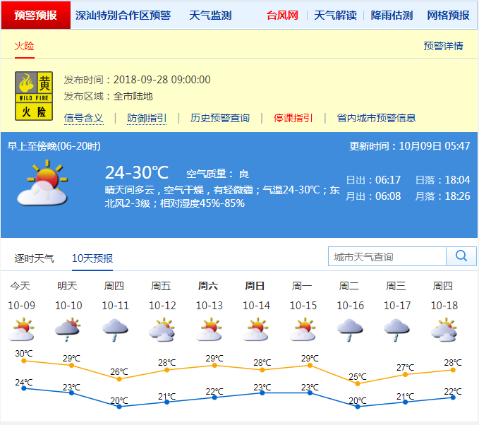 鵬城今日以晴朗天氣為主,部分時間云量較多,早晚溫差增大,最低氣溫在23℃左右,最高氣溫在31℃左右。灰霾仍會潛入鵬城,市民應注意預防呼吸道疾病。