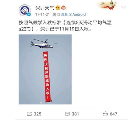 雖然深圳積極嘗試了入秋,但這場弱冷空氣并不妨礙深圳入秋失??!因?yàn)榘礆夂驅(qū)W劃分標(biāo)準(zhǔn):以5天滑動(dòng)平均氣溫穩(wěn)定 ,22 ℃才是秋季的開始。深圳平均入秋時(shí)間在11月3日,去年更是在11月19日才入秋成功。
