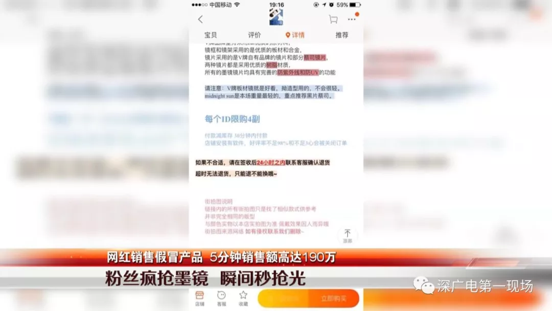 在明知品牌墨鏡有問(wèn)題的情況下,貓娘于某依然在微博上做了預(yù)告,稱自己通過(guò)特殊渠道找到了一批代工廠的墨鏡,在吸引到粉絲關(guān)注以后,她在自己的網(wǎng)店上線銷售。因?yàn)槟R銷售價(jià)格是正品的三分之一,幾千付墨鏡上線幾分鐘就被秒搶光,而這些眼鏡其實(shí)就是小作坊生產(chǎn)出來(lái)的假冒產(chǎn)品。