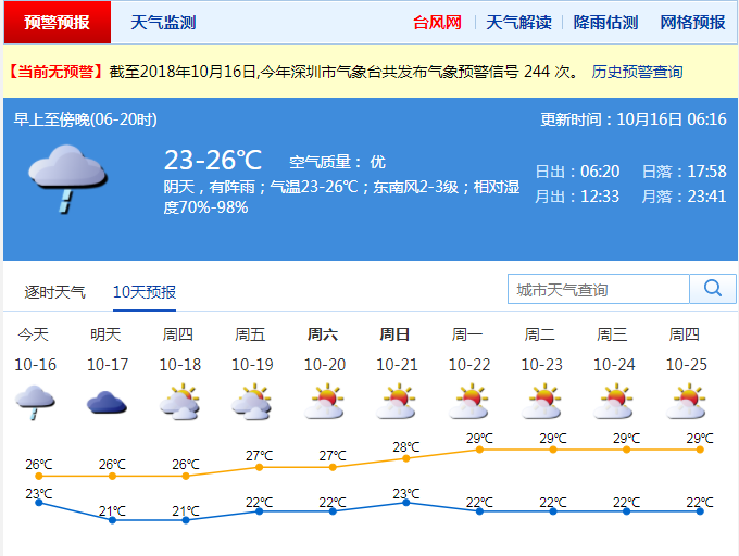 受弱冷空氣和切變線共同影響,16日深圳陰天有中到大雨,局部暴雨,伴有零散雷暴和5~6級陣風(fēng)。預(yù)計降雨將在中午前后減弱,氣溫下降3 ℃~4 ℃,最低氣溫低至21 ℃,最高氣溫在25 ℃左右。17日陰天間多云,偶有零星小雨,氣溫在21 ℃ ~26 ℃。18日起轉(zhuǎn)為多云到晴天,早晚清涼,空氣干燥。